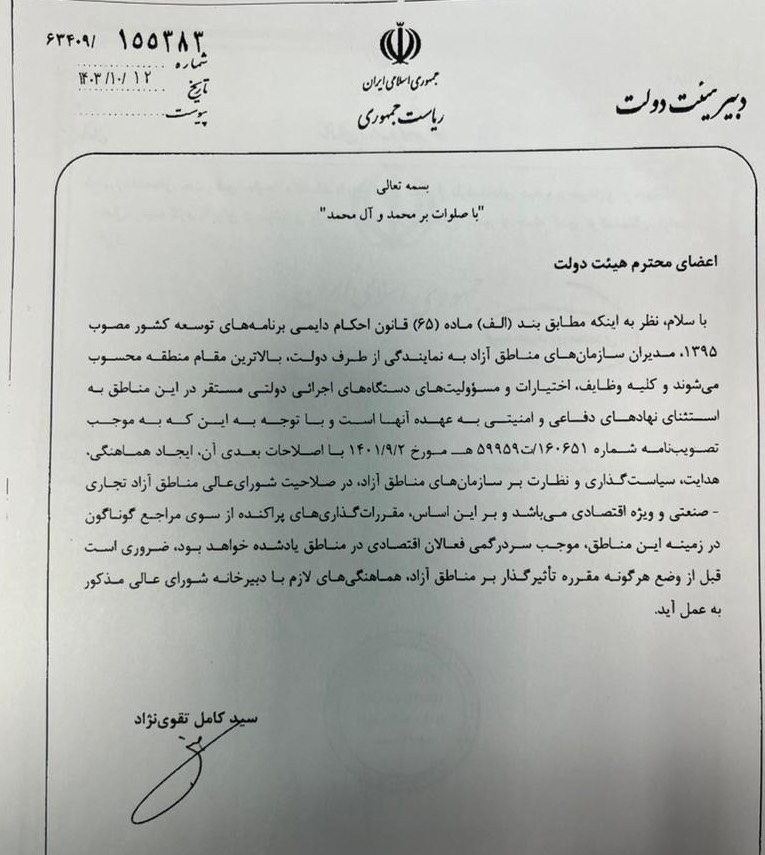 دبیر دولت طی بخشنامه ای صدور هرگونه مقرره توسط دستگاههای اجرایی در ارتباط با مناطق ازاد را منوط به هماهنگی بادبیرخانه شورای عالی نمود